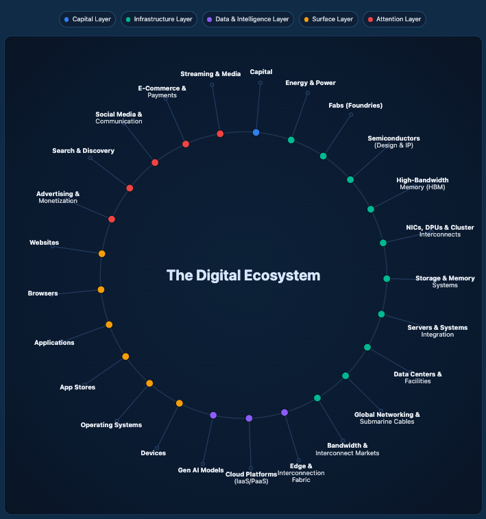 The digital ecosystem is defined today by five critical choke points that reveal how power is consolidating into the hands of a few giants: semicon. The winners won’t just shape the future of technology, they will set the course of the global economy. Artificial intelligence isn’t just accelerating this shift, it’s driving it.